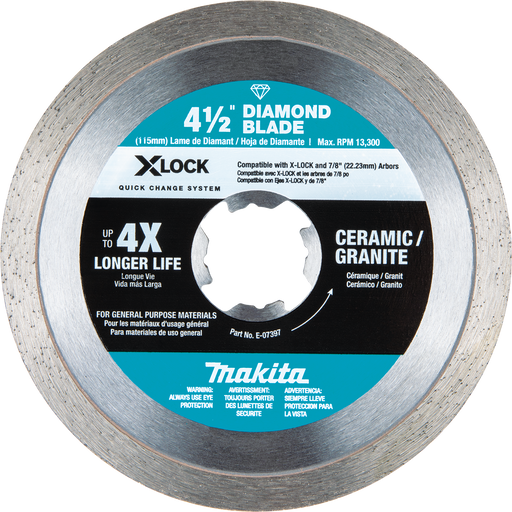 The X-LOCK Quick Change System provides up to 5X faster blade changes. The X-LOCK 4-1/2” Continuous Rim Diamond Blade (E-07397) is designed for cut...