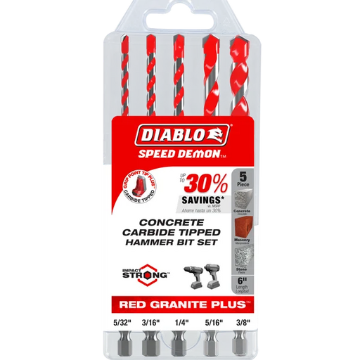 DIABLO TOOLSDiablo’s SPEEDemon™ Red Granite PLUS™ Carbide-Tipped Hammer Drill Bits provide one of the most durable, fastest, and up to 4X longer lasting drilli...