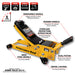 Rapid lift floor jack with a low profile and a lifting capacity of 6,000 lbs. Features a dual-piston rapid lift mechanism.