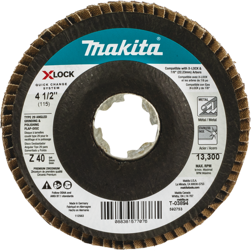 MAKITA USA INCThe X-LOCK 4-1/2” 40 Grip Type 29 Angled Flap Disc is designed to work with angle grinders for fast material removal in blending, deburring, grindi...