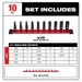 Our SHOCKWAVE Impact Duty™ 1/4" Drive 6 Point Socket Sets feature the boldest, longest-lasting markings and extreme impact durability in high torque applications. The stamped and ink-filled size marking enables you to select the right socket every time throughout the life of the socket. These sockets are engineered with high strength forged steel for optimized performance in heavy-duty applications. The non-slip hex geometry prevents fastener rounding, and a dual-hole design and ring groove allow for easy socket attachment and removal. The customizable Socket Rail comes with removeable end caps to add or take off socket clips for optimal storage. All MILWAUKEE® SHOCKWAVE Impact Duty™ Sockets backed by a Lifetime Guarantee and meet ASME industry standards.
