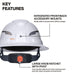 - Hard Hat includes a 300-Lumen rechargeable headlamp with patented strap-free mounting
