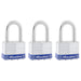 The Master Lock No. 5TRILFPF Laminated Padlocks feature a 2in (51mm) wide laminated steel body for maximum strength and reliability. The 3/8in (10mm) diameter shackle is 1-1/2in (38mm) long and made of hardened boron alloy, offering maximum resistance to cutting and sawing. The 4-pin cylinder prevents picking and the dual locking ball bearings provide resistance against prying and hammering. The Limited Lifetime Warranty provides peace of mind from a brand you can trust.