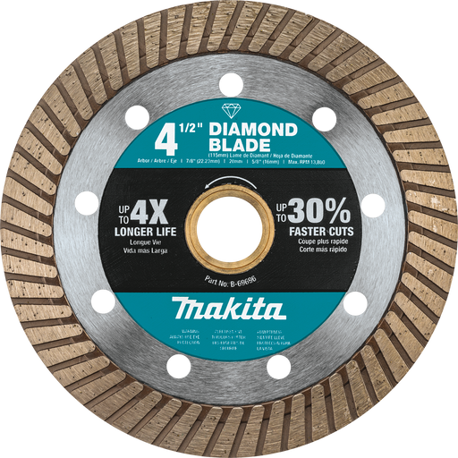 MAKITA USA INCThe Makita 4-1/2" Turbo Rim Diamond Blade is ideal for general purpose cutting applications including block, brick and cured concrete. The turbo ri...