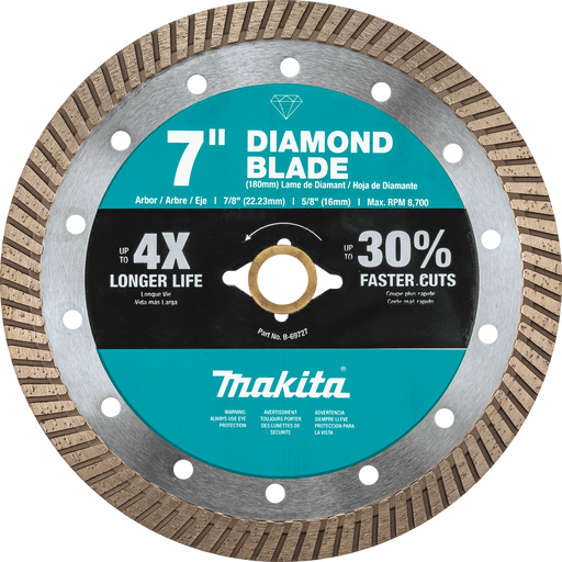 MAKITA USA INCThe Makita 7" Turbo Rim Diamond Blade is ideal for general purpose cutting applications including block, brick and cured concrete. The turbo rim de...