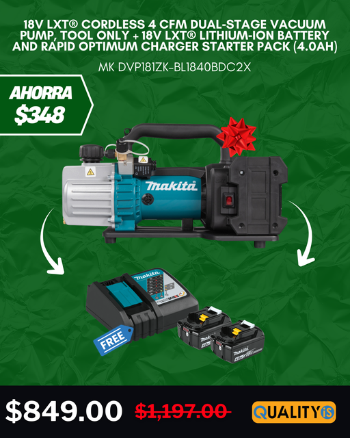 Makita18V LXT® Cordless 4 CFM Dual‑Stage Vacuum Pump, Tool Only The 18V X2 LXT® 4 CFM Dual-Stage Vacuum Pump (DVP181ZK) is a high-power vacuum pump tha...