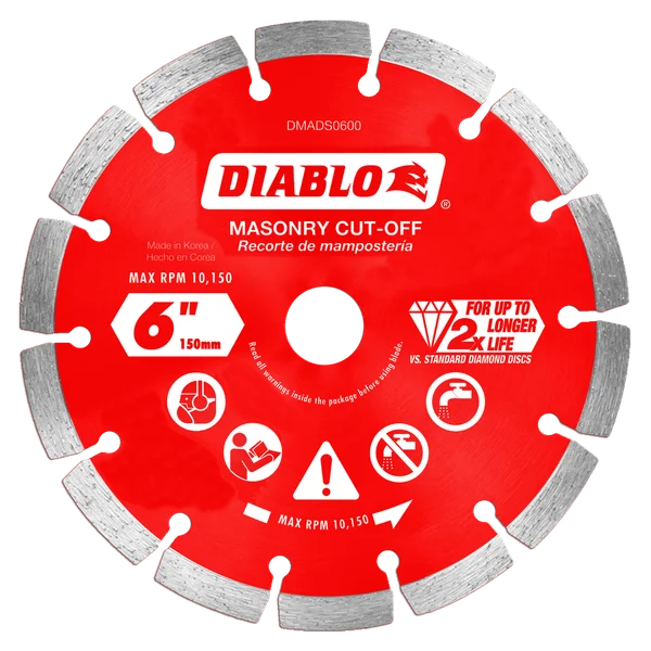 Diablo's diamond segmented masonry cut-off discs provide extreme durability and longer life in concrete, concrete with rebar, brick and cinder block. These diamond rimmed discs deliver up to 2X longer cutting life versus standard diamond cut-off discs. The disc's industrial-grade diamonds with hardened disc body delivers lasting durability and maximizes cutting quality in hardened materials even in extreme applications.